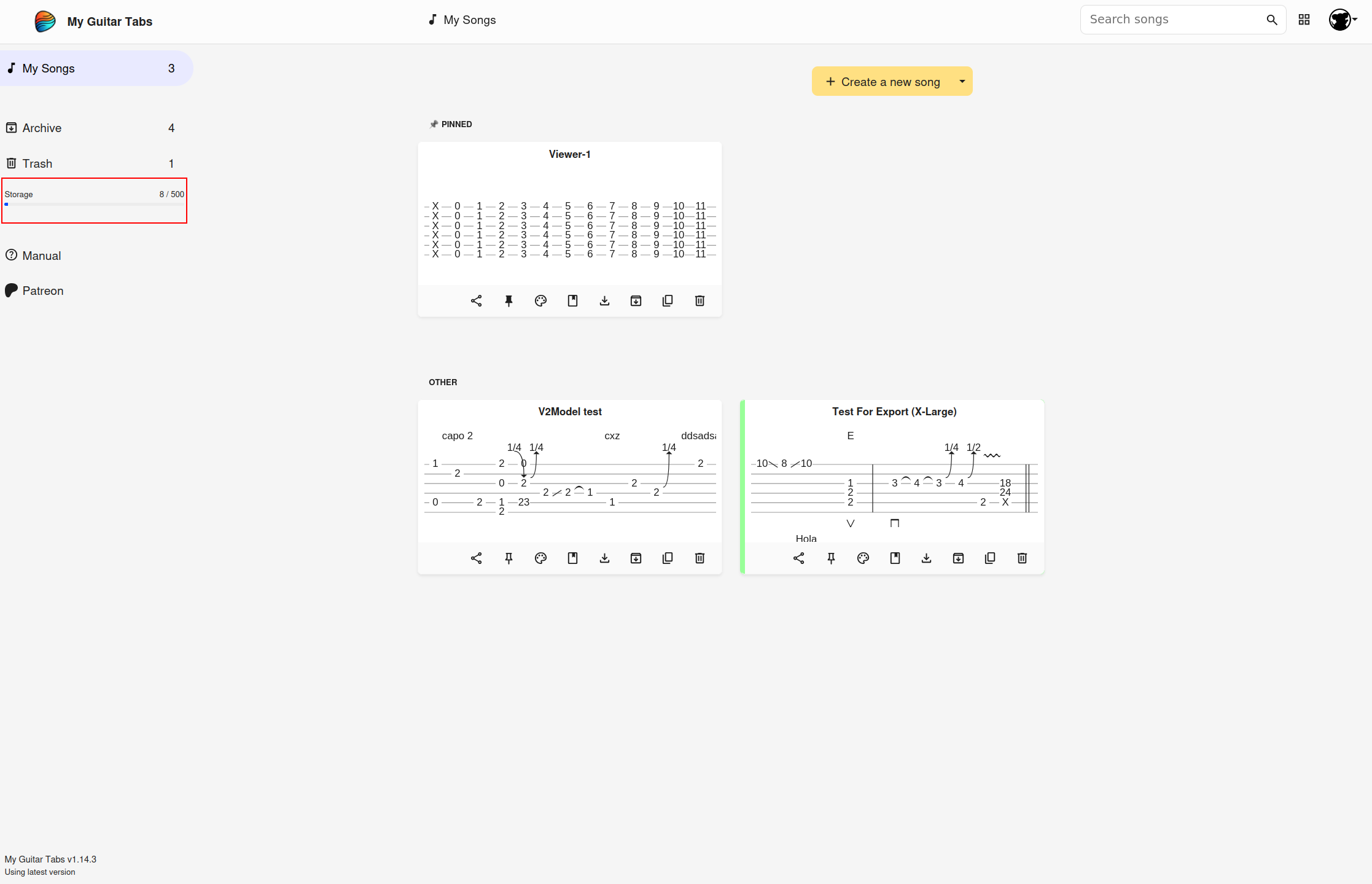 El número total de canciones que tienes y el máximo de canciones que puedes almacenar en My Guitar Tabs se muestra en la barra lateral: