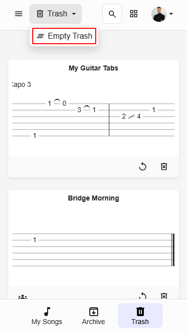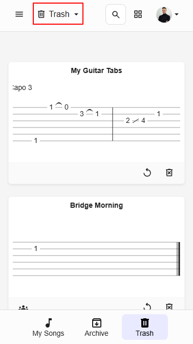 Usa la barra de navegación inferior para cambiar rápidamente entre las carpetas integradas: Mis Canciones, Archivo y Papelera.